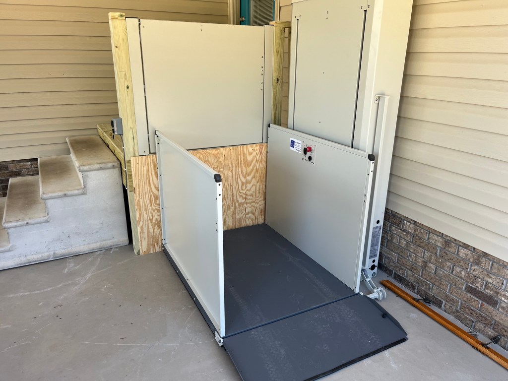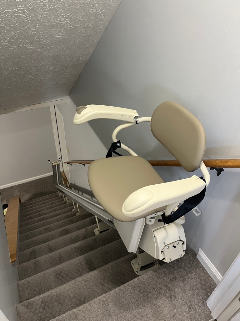 At the same time, I got a stair lift to help me get down into the basement. I was curious about getting down in the basement for practical purposes, but then last night we had tornado warnings, and I realized that until now if I wanted to get into the basement storm shelter, I wasn’t gonna be able to get there. Now that has been solved, and fortunately there were no tornadoes.